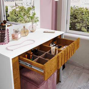 A Penteadeira Camarim Rouge - Bechara Móveis conta com iluminação em LED para uma luz uniforme e suave, ideal para maquiagem. Seu design moderno é realçado por um espelho de formato orgânico, combinando estética e funcionalidade. Com uma gaveta de abertura total e deslizamento suave, você tem acesso fácil a todos os itens, além de uma gaveta organizadora para manter maquiagem e acessórios sempre arrumados e bonitos. Dimensões do Produto Montado: Altura: 156cm Largura: 90cm Comprimento: 43,5cm Observações: – Iluminação em LED – Gaveta com corrediças telescópicas – Gaveta organizadora – Espelho orgânico Marca: Bechara Móveis Modelo: Camarim Rouge Referência: 2076694 ATENÇÃO: Não nos responsabilizamos pela montagem deste produto. Aconselhamos a contratação de um profissional.