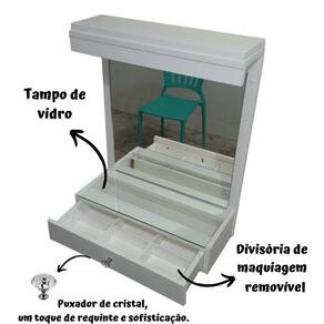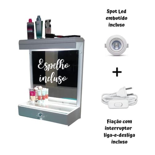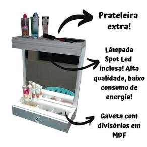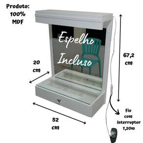Ela chegou a combinação perfeita Camarim Tomada bivolt com interruptor liga-e-desliga Gaveta com divisória para maquiagem e tampo de vidro A penteadeira segue completa, com led incluso, montada, só instalar e começar a usarA penteadeira camarim suspensa jade com gaveta e tampo de vidro foi desenvolvida com materiais de alta qualidade, inclui espelho reforçado, spot led de iluminação que consiste em sistema inovador: o spot de led forma a tríplice perfeita entre design, economia e funcionalidade. É um item moderno, elegante e possui um ótimo desempenho em iluminação que irá ajudar no seu dia a dia na hora de fazer a maquiagem esse móvel multifuncional foi criado para trazer requinte e sofisticação para seu ambiente, inclui tampo de vidro, gaveta com divisória de maquiagem e puxador de cristal transparente.A divisória é removível, ajuste da melhor forma para organizar sua maquiagemO produto é entregue montado, só instalarMaterial: 100% mdfCor: branca Espelho incluso.Led inclusoFiação inclusaTampo de vidro PuxadorO produto segue com as furações, parafusos e manual para instalação.Possui spot led de 5w equivale a 5 lâmpadas de led comum do estilo bolinha .O spot led também é conhecido como lâmpada croica, é equipado com chip de alta qualidade garantindo uma iluminação segura, econômica e excelente para suas makesMedidas: Espelho: 45 x 45 cm Medidas do espelho podem variar em cm'sMoldura: Largura 52 cm Altura 67,5 cmTampo de vidro:20 cmGaveta:Largura 52 cm Profundidade 20 cm Prateleira de cima: Profundidade: 15 cm Largura: 52 cmFio com interruptor: 1,20 m Marca: Marcenaria Sales & Alves