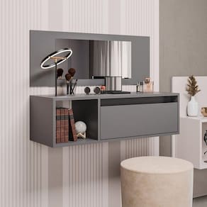 A Penteadeira Camarim Suspensa Mayumi é a escolha perfeita para quem busca funcionalidade e elegância. Ideal para otimizar qualquer espaço, este móvel contém uma largura de 90 cm, oferecendo um espaço amplo para suas necessidades de beleza. Produzida em MDP de alta qualidade, garante durabilidade e resistência. O revestimento em Melamina BP proporciona uma superfície lisa, fácil de limpar. O design suspenso confere um toque contemporâneo ao ambiente, ideal para quem busca uma decoração minimalista e funcional. Acompanha uma espelheira ampla, perfeita para suas rotinas de maquiagem e cuidados pessoais, garantindo praticidade e estilo. Conta com 1 Gaveta com Divisória e 1 nicho na lateral, oferecendo espaço suficiente para organizar seus itens essenciais. Possui uma estrutura robusta que suporta até 20 kg distribuídos, permitindo que você organize seus itens de maneira segura e prática. A montagem suspensa otimiza o espaço disponível, sendo ideal para ambientes menores já o tom Grafite e o design minimalista permitem que esta penteadeira se integre facilmente a qualquer estilo de decoração. No Quarto ela é ideal para rotinas de maquiagem e cuidados pessoais, no Closet ela é essencial para manter seus itens de beleza sempre à mão, no Banheiro é perfeita para manter seus cosméticos e acessórios organizados de maneira prática e estilosa. Gostou? Não perca a oportunidade de transformar seu ambiente e facilitar sua rotina diária. Aproveite!