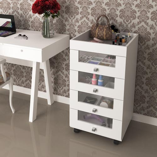 A Penteadeira/Carrinho de Maquiagem com 4 Gavetas Multimóveis, funcional e elegante, é indispensável na hora de se cuidar. Possui 4 gavetas com frente de vidro, corrediças telescópicas, material em MDP e acabamento em pintura UV. Compacta e funcional, permite acomodar diversos itens e acessórios de forma rápida, facilitando muito na hora de sua utilização.