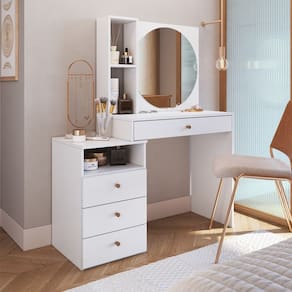 Transforme seu espaço de beleza com a penteadeira suspensa *prática* e elegante, produzida em MDP de alta qualidade com acabamento fosco durável. Equipada com um espelho redondo central que traz sofisticação ao ambiente, ela é perfeita para organizar todos os seus produtos de beleza e acessórios de forma prática e visualmente atraente. Com 4 gavetas espaçosas e 3 nichos versáteis, você terá espaço de sobra para armazenar maquiagens, perfumes e outros itens essenciais do dia a dia, mantendo tudo sempre à mão e bem organizado. A estrutura suspensa traz um toque de modernidade e otimiza o espaço, sendo ideal para quartos ou closets de qualquer tamanho. Além de funcional, esta espelheira agrega estilo e valor ao ambiente, tornando sua rotina de cuidados ainda mais agradável. Este móvel chegará em sua casa separado em 01 Volume.