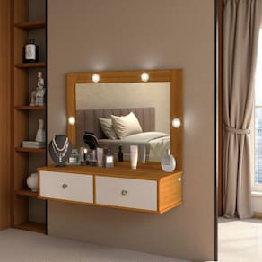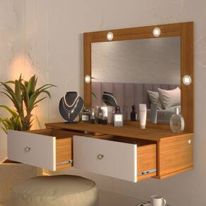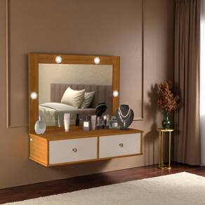 Penteadeira Suspensa Camarim com Espelho Iluminado 4 Leds 2 Gavetas MDF. Transforme seu ambiente com a Penteadeira Suspensa com Espelho e 4 Leds, perfeita para quem busca praticidade, organização e um toque sofisticado na decoração. Produzida em MDF de alta qualidade, com laterais de gaveta em 12mm e estrutura em 15mm, garante resistência e durabilidade no uso diário. Este modelo conta com 2 gavetas espaçosas, sendo 1 com nicho interno para organizar maquiagens, perfumes, acessórios e bijuterias com praticidade. Além disso, possui corrediças telescópicas que oferecem abertura suave e total das gavetas, facilitando o acesso a todos os itens. O espelho amplo com 4 Leds embutidos proporciona iluminação ideal para maquiagem e cuidados pessoais, enquanto as 2 réguas para fixação na parede oferecem segurança e firmeza na instalação. - Design moderno e funcional que valoriza a decoração. - Espelho com iluminação em 4 Leds para maior praticidade. - 2 gavetas espaçosas, sendo 1 com nicho organizador. - Corrediças telescópicas, que garantem suavidade e durabilidade. - Estrutura em MDF 12mm e 15mm, resistente e de alta qualidade. - Instalação segura com 2 réguas de fixação na parede. Medidas Aproximadas: Altura: 86 cm; Largura: 92 cm; Profundidade: 35 cm; Esta penteadeira camarim suspensa é perfeita para quem deseja organização, beleza e praticidade em um só móvel. IMAGENS MERAMENTE ILUSTRATIVAS!