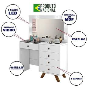 Penteadeira com espelho e luz led casalar luna brancoA penteadeira luna é 100% mdf, sua pintura é uv anti risco, puxadores em metal com acabamento envelhecido, corrediças telescópicas, possui colmeia na gaveta central, bases laterais e tampo mdf 18mm, moldura do espelho mdf 15mm e 20mm, o espelho tem 3mm e o vidro do tampo 4mm. Possuindo 6 led de luz branca, pés em madeira de reflorestamento e 5 gavetas com a frente em mdf 15mm.CaracteristicasTipo: penteadeira camarimModelo: lunaCor: brancoDimensões do produtoAltura: 145cmLargura: 93,5cmComprimento: 43cmObservaçãoNão acompanha banqueta (vendida separadamente)Imagens interna do produto corresponde ao modelo e não a corNecessita de montagem (fica por conta do cliente)Imagens meramente ilustrativasPenteadeira com Espelho e Luz Led Casalar Luna Branco