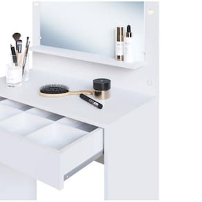 Penteadeira Com Espelho Iluminação Led Star Art In Móveis Branco Conheca a Penteadeira com Iluminacao Led Star fabricada pela Art In Moveis, ela ira tornar mais pratica a sua producao do dia a dia! Acompanha o espelho e kit eletrico com 4 lampadas led e interruptor de liga/desliga. Tambem divisores de gaveta para melhor organizar seus objetos. Produzida em excelente material, MDP 15 mm e com acabamento em Finish Foil Acetinado, que garante maior resistencia e qualidade em seu movel. A essencia de criar solucoes que trazem mais conforto sua vida e o grande diferencial dos produtos Art In Moveis. Cada nova ideia e uma mistura de criatividade, funcionalidade e muita dedicacao. Dimensoes do produto montado: Altura: 127,8 cm Largura: 72 cm Profundidade: 38 cm Peso: 15,1 Kg