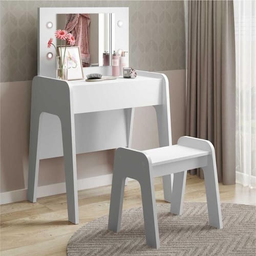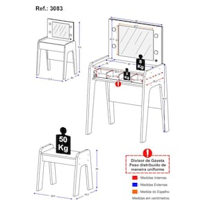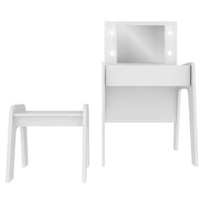 Conteúdo da Embalagem: 1 (uma) Penteadeira/escrivaninha 1 (um) Kit luzes de LED 1 (um) Banco Manual de montagem Kit ferragem