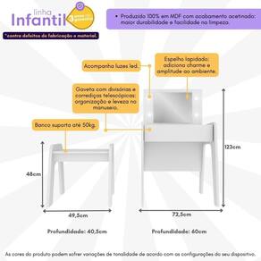 Dimensões do produto montado:Penteadeira: Altura: 123cm | Largura: 72,5cm | Profundidade: 60cmBanco: Altura: 48cm | Largura: 49,5cm | Profundidade: 40,5cm*Você pode consultar as medidas detalhadas na imagem técnica do produto.