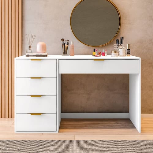 A Penteadeira Vita une praticidade e estilo em um design moderno e sofisticado. Composta por 5 gavetas espaçosas, sendo 4 laterais organizadas em formato de gaveteiro e 1 gaveta central maior sob o tampo, que oferece amplo espaço para armazenar maquiagens, acessórios e objetos pessoais com praticidade, pois conta com um porta-objetos interno, ideal para manter tudo em ordem e sempre à mão.