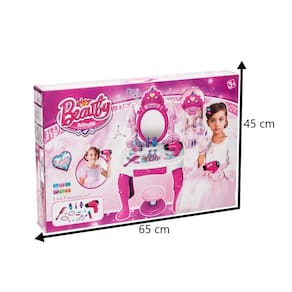 Conteúdo da Embalagem: 1 - Base de plástico montável com espelho de plástico; 1 - Banquinho de plástico montável; 2 - Pulseiras; 1 - Par de brincos; 2 - Frascos de cores diferentes 1 - Batom; 1 - Pente; 2 - Anéis de modelos diferentes; 1 - Secador de brinquedo; 2 - Presilhas para cabelo;