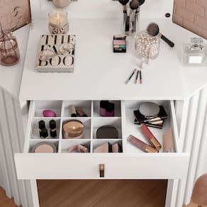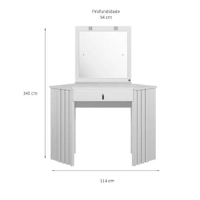que tal a penteadeira glitter? sempre bom ter aquele cantinho preparado para se arrumar, né? a penteadeira glitter, além de ser funcional e ter 1 gaveta com divisórias, tem também um design clean que te ajudará a deixar seu espaço bonito e acolhedor - seja no quarto ou no closet. pensada para facilitar o dia a dia, a peça tem corrediças telescópicas, que abrem com mais suavidade e têm mais amplitude, e ainda conta com espelho e 2 lâmpadas de led, proporcionando a iluminação ideal para seus momentos de autocuidado. Marca: Modern