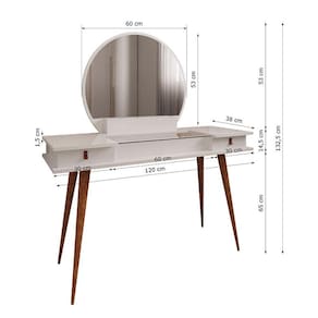 Material: MDP 15 mm e MDF 12 mm, espelho 3 mm e tampo de vidro de 5 mm e pés em Madeira Maciça;