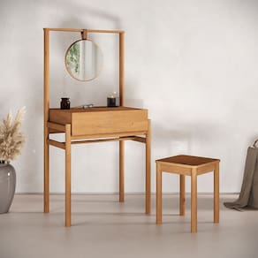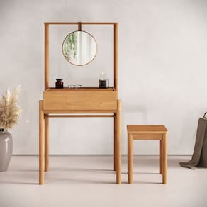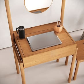 Muito mais que uma escrivaninha ou penteadeira, esta peça é um convite ao minimalismo funcional. Com design verticalizado, espelho circular suspenso ajustável com sete opções de regulagem ocultas e suporte em couro, traduzido em linhas limpas, ela transforma qualquer ambiente em um espaço de beleza, trabalho ou contemplação.