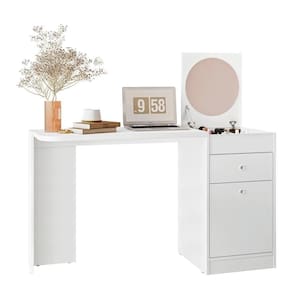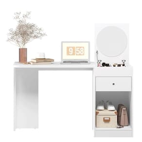 A Penteadeira Escrivaninha Desejo é a união perfeita entre funcionalidade e design. Com estrutura em MDP e pintura UV, oferece durabilidade e um acabamento de alta qualidade. Conta com 2 portas, sendo uma basculante com pistão a gás, além de 1 gaveta com corrediças telescópicas para organização prática. O tampo de 25 mm com canto arredondado proporciona um toque de elegância e . O espelho redondo incluso ( 0,35m) completa o conjunto, tornando este móvel ideal tanto para suas rotinas de beleza quanto para uso como escrivaninha.