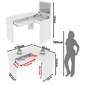 A Penteadeira Escrivaninha PE2020 é produzida em MDP 15mm e pintura UV. Possui 1 gaveta com corrediça metálica, que suporta 3kgs. O tampo tem abertura basculante, com dobradiças, pistão e espelho 3mm colado; no interior possui divisórias. Os dois tampos suportam 15kgs cada. Produto suporta até 33kgs. Conteúdo da embalagem: móvel, ferragens e manual de montagem. A fixação das peças e/ou acessórios é feita por parafusos, cavilhas e minifix. Para uma limpeza mais efetiva, utilizar apenas pano macio umedecido e sabão neutro. Não utilizar produtos abrasivos. Garantia de 03 meses contra defeitos de fabricação. Medidas do produto (AxLxP): 74,5x110x99,6 (fechada), (AxLxP): 125x110x99,6cm (aberta). Peso do produto: 29,9kgs.