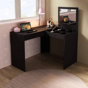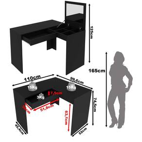 A Penteadeira Escrivaninha PE2020 é produzida em MDP 15mm e acabamento em BP. Possui 1 gaveta com corrediça metálica, que suporta 3kgs. O tampo tem abertura basculante, com dobradiças, pistão e espelho 3mm colado; no interior possui divisórias. Os dois tampos suportam 15kgs cada. Produto suporta até 33kgs. Conteúdo da embalagem: móvel, ferragens e manual de montagem. A fixação das peças e/ou acessórios é feita por parafusos, cavilhas e minifix. Para uma limpeza mais efetiva, utilizar apenas pano macio umedecido e sabão neutro. Não utilizar produtos abrasivos. Garantia de 03 meses contra defeitos de fabricação. Medidas do produto (AxLxP): 74,5x110x99,6 (fechada), (AxLxP): 125x110x99,6cm (aberta). Peso do produto: 29,9kgs.