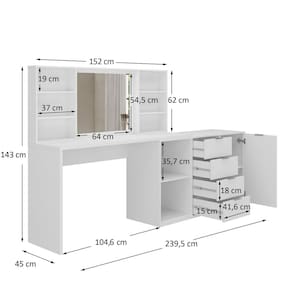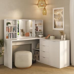 Transforme sua rotina com a Penteadeira Escrivaninha Versátil Foscarini, criada para unir beleza, funcionalidade e sofisticação. Com design moderno, ela conta com espelho elegante e kit 2 lâmpadas de LED, que oferecem iluminação clara, economia de energia e praticidade no dia a dia. São 4 gavetas espaçosas com corrediças telescópicas, que garantem abertura total e deslizamento suave, além de nichos abertos ideais para expor perfumes, maquiagens ou objetos decorativos. Os puxadores em alumínio trazem um toque de requinte, enquanto o acabamento premium assegura resistência e durabilidade. A montagem é personalizável, permitindo 4 formas diferentes de uso, adaptando-se ao seu espaço. Fácil de limpar e de montar, é o móvel perfeito para deixar seu ambiente mais organizado e funcional. Acabamento da Gaveta: BP Acabamento da Porta: BP Acabamento da Prateleira: BP Acompanha Banqueta: Não Acompanha Lâmpada: 02 Altura do Espelho: 54,5 cm Ambiente Principal: Escritório codigo_ean: 7900288249746 Complexidade da Montagem: Média: pode ser montado por mais de uma pessoa e/ou necessite de maior conhecimento para montagem Cor: Branco Cor do Produto: Branco Cor do Puxador: Alumínio Cor Interna: Branco Escala de Brilho: Fosco Escala de Brilho da Gaveta: Fosco Escala de Brilho da Porta: Fosco Escala de Brilho da Prateleira: Fosco Espessura do Espelho: 3 mm Fita Integrada: Sim Formato do Espelho: retangular Gaveta com Chave: Não Informações Complementares: 4 opções de montagem Itens Inclusos: 1 Penteadeira, Kit Ferragens e Manual de Montagem Largura do Espelho: 64 cm Linha ou Coleção: Foscarini Manual de Montagem e Instalação: https://product-hub-prd.madeiramadeira.com.br/127709643/documents/2aab1ad5-e13a-4d22-bbd5-bb245c5639733242203466317589141303565.pdf Marca: Foscarini Material da Gaveta: MDP Material da Porta: MDP Material da Prateleira: MDP Material do Puxador da Gaveta: Alumínio Material do Puxador da Porta: Alumínio Material Principal: MDP Necessita Montagem: Sim Origem do Produto: Nacional Peso: 83 kg Peso Máximo por Gaveta: 10 kg Peso Máximo por Prateleira: 10 kg Possui iluminação: Sim Possui Moldura: Não Possui Pés: Não Possui Porta Objetos: Sim Possui Portas: 01 Possui Prateleiras: 06 Possui Vidro: Não Quantidade de Espelho: 01 Recomendações de Uso, Manutenção e Limpeza: Limpar com flanela ou pano macio seco, não utilizar produtos abrasivos, desengordurantes, álcool ou solvente. Não expor o produto diretamente à luz solar e à umidade. Sapatas Niveladoras: Não Sistema de Montagem: Fácil, rápido e descomplicado, parafusos, minifix e cavilhas. Suporta Até (kg): 160 kg Tampo Basculante: Não Tipo de Corrediça da Gaveta: Metálica Telescópica Tipo de Dobradiça/Corrediça da Porta: Aço Tipo de Fixação do Espelho: Fita Dupla Face Tipo de Lâmpada: LED Tipo de Porta: Abrir Tipo de Puxador da Gaveta: Externo Tipo de Puxador da Porta: Externo