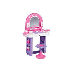 A penteadeira Miss Glamour tem banquinho e cores charmosas para se produzir! O brinquedo vem com muitos acessórios de beleza: pente, escovinha, porta jóias, pulseira, presilhas, secador e uma pranchinha. O espelho fica em 3 posições.
