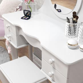 Queridinhas das meninas e mulheres, as penteadeiras geralmente roubam a cena e encantam. É hoje um dos móveis mais desejados para integrar a decoração com muito glamour. A penteadeira Princesa, vem com seu visual clássico contemporâneo tornando-a mais charmosa. Conta com 4 gavetas, espelho que trás com ela a funcionalidade de poder guardar de forma organizada produtos que vão fazer sobre sair a beleza feminina.