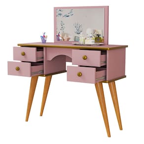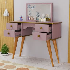 - Penteadeira infantil rosa com espelho - 4 gavetas para guardar acessórios e maquiagens - Estrutura em MDF/MDP de alta resistência - Pés palito em madeira com design retrô - Ideal para decoração de quartos infantis
