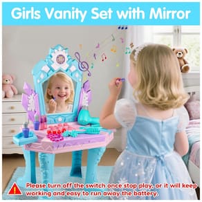 A penteadeira infantil Tsomtto com tema inspirado em Frozen é composta por mesa, cadeira e espelho central com iluminação e efeitos sonoros, formando uma estação compacta de maquiagem de faz de conta para crianças pequenas. O espelho possui imagens de princesa e ativação de músicas e luzes, enquanto a bancada acomoda os acessórios de brincadeira, como anéis, frascos de perfume, elásticos de cabelo, colares, presilhas, batons de brinquedo, espelho de mão, pente e secador que emite som. A estrutura é produzida em material plástico com cantos arredondados, espelho acrílico inquebrável e montagem simples por encaixe, exigindo 4 pilhas AA para funcionamento dos recursos eletrônicos.