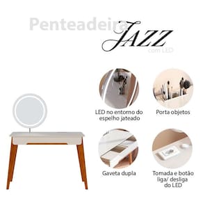 A penteadeira da linha Jazz é uma peça elegante e funcional que certamente acrescentará ao seu ambiente. Possuindo uma gaveta dupla espaçosa, ideal para guardar suas maquiagens e objetos. A moldura do espelho com haste em aço é giratória, proporcionando flexibilidade para ajustar conforme necessário. Contando com um porta objeto para manter seus itens organizados e ao seu alcance. Um dos destaques é a presença de uma tomada embutida, oferecendo praticidade para conectar seu aparelho. O botão de liga/ desliga do LED, juntamente com a iluminação LED ao redor do espelho, proporcionando um ambiente agradável. Seu pé em madeira maciça garante mais estabilidade e robustez. Com materiais de alta qualidade e um design sofisticado, é produzido pela Imcal, sendo a escolha ideal para quem busca praticidade, elegância e funcionalidade em um único móvel. Confira e garanta o seu!