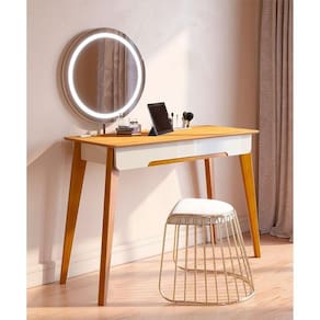 A penteadeira da linha Jazz é uma peça elegante e funcional que certamente acrescentará ao seu ambiente. Possuindo uma gaveta dupla espaçosa, ideal para guardar suas maquiagens e objetos. A moldura do espelho com haste em aço é giratória, proporcionando flexibilidade para ajustar conforme necessário. Contando com um porta objeto para manter seus itens organizados e ao seu alcance. Um dos destaques é a presença de uma tomada embutida, oferecendo praticidade para conectar seu aparelho. O botão de liga/ desliga do LED, juntamente com a iluminação LED ao redor do espelho, proporcionando um ambiente agradável. Seu pé em madeira maciça garante mais estabilidade e robustez. Com materiais de alta qualidade e um design sofisticado, é produzido pela Imcal, sendo a escolha ideal para quem busca praticidade, elegância e funcionalidade em um único móvel. Confira e garanta o seu!