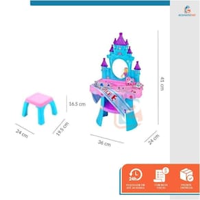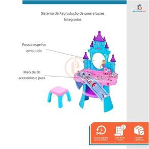 Penteadeira Musical Castelo Princesa Com Banquinho Baby Style A Penteadeira Musical com Banquinho Baby Style tem um lindo formato de castelo digno de uma princesa. Um camarim próprio com mais de 30 acessórios e jóias, e claro o mastro e uma coroa com detalhes apaixonantes para ficar ainda mais linda. Diferente de todas as penteadeiras, a penteadeira é divertida e educativa, conta com um lindo sistema de som e luz para dar um charme mais especial para a brincadeira. Tem um espelho perfeito para as princesas se admirarem. Suas cores são vibrantes e harmonizam entre si. Tudo pensado para o faz de conta estar à altura desta princesa, podendo montar e posicionar os adereços da forma que preferir. - Interação com a família;- Aprende brincando manualmente;- Desperta a adaptação social e interação;- Aprendizado pela repetição;- Expressão e comunicação;- Imaginação e criatividade;- Estimula a coordenação motora;- Incentiva e induz à autonomia da criança em montar e desmontar seu próprio brinquedo; - As peças podem ser guardadas no próprio compartimento. CARACTERÍSTICAS TÉCNICAS:Material: Plástico PPMedidas modo carrinho: 41cm altura x 36cm largura x 24cm comprimento Idade recomendada: A partir dos 3 anosProduto certificado pelo INMETRO 004181/2020Necessita de 3 pilhas AA Não incluso Peso: 1,1kgMarca: Baby StyleRef.: 668637