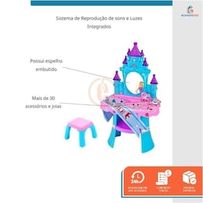 Penteadeira Musical Castelo Princesa Com Banquinho Baby Style A Penteadeira Musical com Banquinho Baby Style tem um lindo formato de castelo digno de uma princesa. Um camarim próprio com mais de 30 acessórios e jóias, e claro o mastro e uma coroa com detalhes apaixonantes para ficar ainda mais linda. Diferente de todas as penteadeiras, a penteadeira é divertida e educativa, conta com um lindo sistema de som e luz para dar um charme mais especial para a brincadeira. Tem um espelho perfeito para as princesas se admirarem. Suas cores são vibrantes e harmonizam entre si. Tudo pensado para o faz de conta estar à altura desta princesa, podendo montar e posicionar os adereços da forma que preferir.