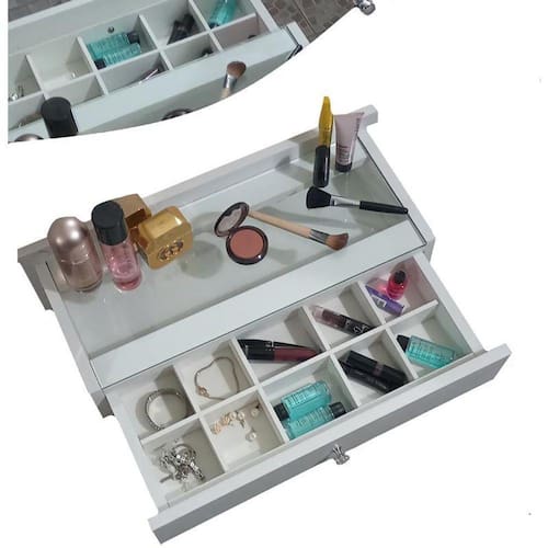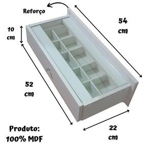 Chegou o modelo que faltava linda e delicada a penteadeira de parede nina chegou para deixar seu ambiente mais charmoso e moderno, com seu estilo little, você pode organizar de maneira econômica sua maquiagem ou joias de uma maneira eficiente, nunca foi tão prático e fácil ter um organizador de make e/ou joias lindo e moderno ocupando pouquíssimo espaço como a ninaO produto possui acabamento premium e é fabricado com material de primeira qualidade 100% mdf , o que gera durabilidade, elegância e resistência, a penteadeira também possui repartições internas que podem ser removíveis, se desejar e organizar do seu jeitoPossui também puxador de gaveta em acrílico estilo cristal proporcionando sofisticação a peça.Tampo de vidro resistente incluso.Medidas: Comprimento: 52 cm Largura: 22 cm Altura: 10 cm Inclui: 1 gaveta penteadeira com organizador1 puxador acrílico cristal 1 tampo de vidroParafusos para sustentação do produto. Obs: não inclui espelhoDiferencial: Acabamento premium 100% mdfProduto personalizado Fabricação própria Obs: pode haver pequena variação em cms nas medidas Entregamos o produto montado só fazer a instalação Marca: Marcenaria Sales & Alves