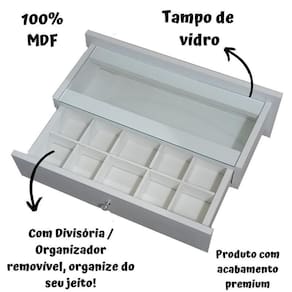 Inclui: 1 gaveta penteadeira com organizador 1 puxador acrílico cristal 1 tampo de vidro Parafusos para sustentação do produto.