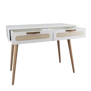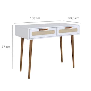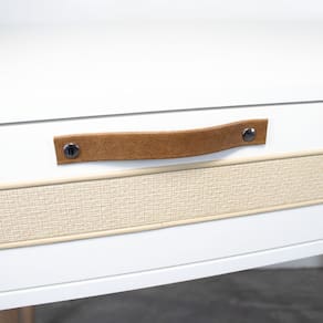 - Estrutura em MDP BP de 15 mm, resistente e com ótimo acabamento - Frentes de gaveta com tela sustentável, visual artesanal e elegante - Puxadores em couro que adicionam um toque sofisticado - Pés em madeira natural maciça, com excelente estabilidade - Design retrô com linhas suaves e acabamento refinado - Versatilidade de uso: pode ser usada como penteadeira, aparador ou escrivaninha - Compacta e funcional, ideal para ambientes com espaço reduzido