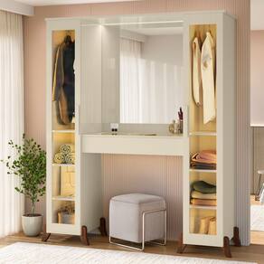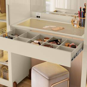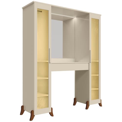 Estrutura: MDP/MDFAcabamento: Pintura UV. Acabamento interno na cor do produtoPorta: Sim 02 portas reflecta Gaveta: Sim 01 gaveta com corrediças telescópicas, com colméia para organizar e guardas suas joias, relógiosTampo: Vidro acima da gaveta para melhor visualização da colméia Espelho: Sim no quadro central Puxadores: Sim em MDF Prateleiras: Sim sendo 06 prateleiras internasCabideiro/Calceiro: Sim em alumínioPes: Sim sendo 08 pés arredondadosTomada: Sim tomada prática de energiaLED: Sim, luz de LED cor quenteDimensões do produto montado