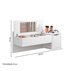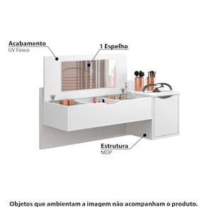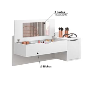 A Penteadeira Camarim Blush é para você que possui pouco espaço, mas deseja um local apropriado para o momento do make. Um móvel incrível, no que se refere a funcionalidade, praticidade e organização. Com 1 porta de bater na lateral, 1 porta basculante com pistão a gás e espelho, além de 1 nicho com 3 repartições para guardar as maquiagens. Ideal para ambientes pequenos, pois fica suspenso a parede deixando a circulação livre.