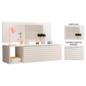 A Penteadeira Suspensa Joy, da Peternella, vai trazer estilo, elegância e organização para seu dormitório. Com um design moderno e seguindo tendências do mercado, como a gaveta com detalhe ripado e estrutura reforçada feita em MDP 15 mm com acabamento em BP, essa penteadeira com espelho deixará os seus momentos de cuidados muito mais agradáveis. Já as suas makes ficarão bem guardadas e protegidas na gaveta com corrediças metálicas e de quebra, você aproveita o nicho lateral para dispôr itens decorativos, deixando tudo com a sua cara.