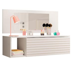 A Penteadeira Suspensa Joy, da Peternella, vai trazer estilo, elegância e organização para seu dormitório. Com um design moderno e seguindo tendências do mercado, como a gaveta com detalhe ripado e estrutura reforçada feita em MDP 15 mm com acabamento em BP, essa penteadeira com espelho deixará os seus momentos de cuidados muito mais agradáveis. Já as suas makes ficarão bem guardadas e protegidas na gaveta com corrediças metálicas e de quebra, você aproveita o nicho lateral para dispôr itens decorativos, deixando tudo com a sua cara.