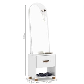 Se você está em busca de um móvel que alie praticidade, elegância e charme, a Penteadeira com Espelho 1 Gaveta Branco é a escolha perfeita para você. Dimensões do produto montado: Altura: 148 cm Largura: 45 cm Profundidade: 33 cm Características: - Material MDP/MDF - Cor branco - Gaveta - Nicho - Pés - Espelho Itens Incluso: 01 Penteadeira. Kit completo para montagem. Manual de montagem. Observações: - Não nos responsabilizamos pela montagem do produto. - Sistema de Montagem: Parafusos, Cavilhas e Tampos. - É recomendado que a montagem seja feita por um profissional qualificado. - As imagens indicam uma sugestão de uso e são apenas ilustrativas, os objetos decorativos não estão inclusos. - Ao iniciar a montagem, forre o chão com o papelão das embalagens para proteger as peças de arranhões. Instruções e Cuidados: Limpar com pano seco, manter em lugar livre de umidade, ao abrigo de exposição direta ao sol.