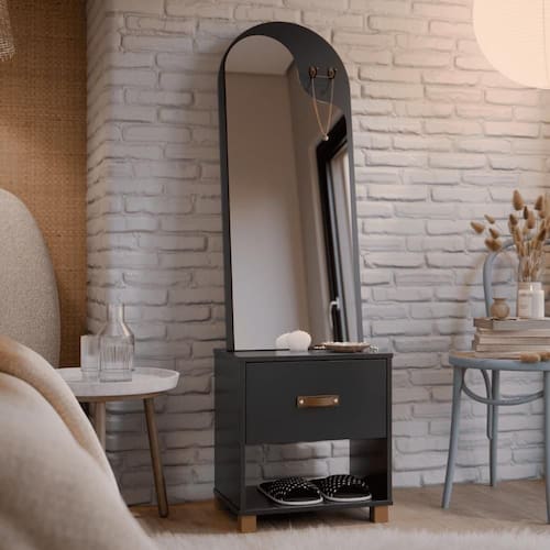 Penteadeira Toucador Miami Preto Se você está em busca de um móvel que alie praticidade, elegância e charme, a Penteadeira com Espelho 1 Gaveta Branco é a escolha perfeita para você. Dimensões do produto montado: Altura: 148 cm Largura: 45 cm Profundidade: 33 cm Características: - Material MDP/MDF - Cor preto - Gaveta - Nicho - Pés - Espelho Itens Incluso: 01 Penteadeira. Kit completo para montagem. Manual de montagem. Observações: - Não nos responsabilizamos pela montagem do produto. - Sistema de Montagem: Parafusos, Cavilhas e Tampos. - É recomendado que a montagem seja feita por um profissional qualificado. - As imagens indicam uma sugestão de uso e são apenas ilustrativas, os objetos decorativos não estão inclusos. - Ao iniciar a montagem, forre o chão com o papelão das embalagens para proteger as peças de arranhões. Instruções e Cuidados: Limpar com pano seco, manter em lugar livre de umidade, ao abrigo de exposição direta ao sol. GARANTIA DO FABRICANTE: 3 | QUANTIDADES DE CAIXAS DE EMBALAGEM: 1 | COR PREDOMINANTE: PRETO | CORES DO PRODUTO (FILTRO DE CORES): PRETO | DESCRIÃ?Ã?O DO TAMANHO: 148X45X33 | MATERIAL PRINCIPAL: MDP/MDF | ESTADO DE ORIGEM: SP | INSTRUÃ?Ã-ES/CUIDADOS: Limpar com pano macio e seco, nÃo utilizar produtos abrasivos. | PRODUTO PRECISA DE MONTAGEM?: Sim, a montagem à facil mas sugerimos a contrataÃÃo de um montador profissional para a montagem do produto. NÃo nos responsabilizamos por danos causados no ato da montagem. | ALTURA DO PRODUTO (CM): 148 | LARGURA DO PRODUTO (CM): 45 | COMPRIMENTO DO PRODUTO (CM): 33 | PESO DO PRODUTO (KG): 14 | ALTURA DO PRODUTO COM EMBALAGEM (CM): 8 | LARGURA PRODUTO COM EMBALAGEM (CM): 43 | COMPRIMENTO PRODUTO COM EMBALAGEM (CM): 101 | PESO PRODUTO COM EMBALAGEM (KG): 14 | PRODUTO: PENTEADEIRA | MARCA: CASAH | QUANTIDADE DE GAVETAS: 1 | QUANTIDADE DE NICHOS: 1 | POSSUI ESPELHO: SIM | QUANTIDADE DE PRATELEIRAS: 1