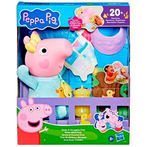A irmãzinha da Peppa, Evie, chegou! As crianças vão adorar recriar suas cenas favoritas com sua própria boneca bebê Evie. Quando as crianças dão a mamadeira à Evie, ela emite sons adoráveis na hora da refeição. Ou dê a ela a chupeta para ouvir mais sons fofos. Mover a Evie para cima e para baixo para ouvir os efeitos sonoros de brincadeira, como risadas e "oincs". Imaginar-se pulando em poças de lama com o tapete de brincar. Na hora de fingir que estão dormindo, as crianças podem deitar a boneca bebê fofinha para ouvir uma canção de ninar e depois roncar!