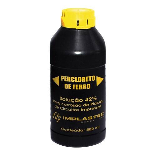 Percloreto Liquido Implastec 500ml Informações do Produto O Cloreto Férrico ou Percloreto de Ferro ? IPF, como é mais conhecido, é um sal que em solução aquosa é para corrosão das placas de circuito impresso (CI), tanto de fenolite como de outros plásticos. A Implastec fornece o sal anidro ou solução já pronta para uso. Principais Aplicações O IPF deve ser utilizado para corrosão de cobre em geral, principalmente em placas de circuito impresso (CI). Caracteristicas O percloreto como solução pronta para uso possui: ? FeCl3: 40% +-1%; ? FeCl2: 0,5% +- 1%; ? Estabilidade: Sensivel a luz, deve ser mantido em ambiente escuro. ? A solubilização do sal Anidro em água é exoTérmica e de velocidade alta, deve-se verter o sal lentamente na água, sob agitação, nunca a água no sal. Manuseio e Método de Aplicação O IPF não é inflamável e nem combustivel, porém, é corrosivo, sendo necessário uso de equipamento de proteção individual (EPI) no manuseio. Deve ser recipiente e bastão para agitação em plástico ou vidro. O banho pode ser utilizado para varias corrosões, aTé que se observe que o tempo de corrosão é longo demais. Embalagem Solução pronta para uso: frascos de 500ml; Ean: 7898446730550