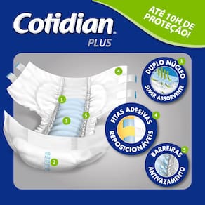 Com até 10 horas de proteção dia e noite, as Fraldas Descartáveis Adulto Cotidian Plus conta com uma nova cobertura interna que garante uma pele 40% mais seca, além de ser de ser desenvolvida com duplo núcleo superabsorvente, barreiras antivazamentos e elástico entre as pernas, garantindo assim total segurança, bem-estar e conforto.