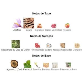 Notas de topo: Açafrão, Couro, Caramelo, Bagas Vermelhas e Pêssego; Notas de coração: Nagarmota ou Óleo de Cipriol, Notas Amadeiradas, Pimenta Rosa, Ládano e Gengibre; Notas de fundo: Agarwood Oud , Patchouli, Baunilha, Benjoim, Almíscar e Bálsamo do Peru. Ean: 5055810007713