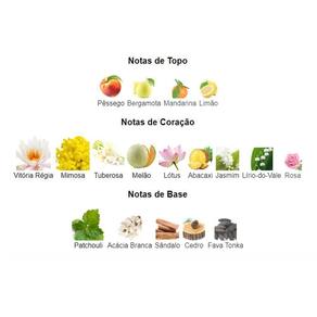 Notas de Coração: Vitória Régia, Mimosa, Tuberosa, Melão, Lótus, Abacaxi, Jasmim, Lírio-do-Vale e Rosa.