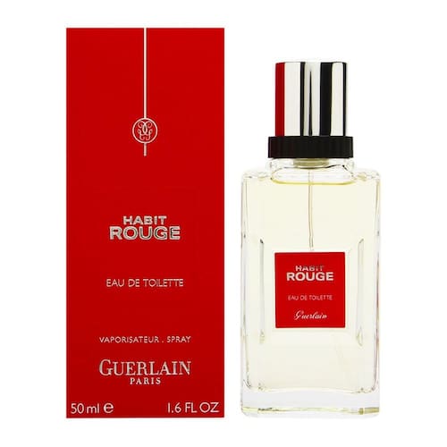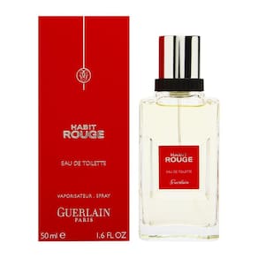 Spray de água de toilette Guerlain Habit Rouge para homens, 1,7 onças — A Eau de Toilette Habit Rouge da Guerlain é uma fragrância amadeirada âmbar para homens — As notas principais são limão, jacarandá brasileiro, laranja, bergamota, limão, tangerina e manjericão — as notas médias são rosa, cravo, sândalo, canela, patchouli, jasmim e cedro — as notas médias são rosa, cravo, sândalo, canela, patchouli, jasmim e cedro, Couro, âmbar, benjoim, musgo de carvalho e ládano