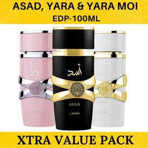 O conjunto de perfumes Lattafa Yara, Asad e Yara Moi Eau de Parfum 100ml oferece uma experiência olfativa diversificada e marcante, com fragrâncias que combinam elementos tradicionais da perfumaria árabe com toques modernos e sofisticados.?