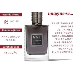 Perfume Masculino O.U.I Le Charmeur 250 Eau de Parfum 75ml O.U.I Le Charmeur 250 Eau de Parfum 75ml Diante do célebre Mur des je t'aime, em Montmartre, você se encontra entre uma coreografia de olhares. Sua séduction despretensiosa cativa com a arte do savoir-vivre e savoir-faire. Ao seu redor, a atmosfera acende, convidando à entrega plena com sua confiança e carisma irresistíveis do amant fraçais. Le Charmeur 250 Eau de Parfum convida você a vivenciar a sedução reinventada, ressignificando a arte da conquista com uma fragrância tão única quanto marcante. Para o homem que é autoconfiante, expert e exigente, este eau de parfum é um passaporte para o savoir vivre e o savoir faire francês. Le Charmeur é uma fragrância inspirada no autêntico charme do homem francês e o número 250 é uma homenagem poética às 250 línguas em que eu te amo está escrito no Mur des je t'aime, em Montmartre, Paris. Um convite para explorar cada momento com confiança e carisma. Assinada pela perfumista francesa Amandine Clerc Marie, esta fragrância amadeirada floral combina a intensidade do zimbro com a elegância floral da írise as nuances aromáticas do Patchouli Cada borrifada é uma declaração de estilo e personalidade. Como todos os eaux de parfum O.U.I, Le Charmeur 250 leva em sua composição a LEssence de Grasse, um óleo essencial criado a partir das cinco colheitas de Grasse, no Sul da França - Rosa, lavanda, mimosa, folhas de violeta e sálvia. Essa é a essência do savoir-faire da alta perfumaria francesa. Nenhum produto O.U.I é testado em animais, ou seja, este item possui selo Cruelty Free. /le Charmêur/ Muro dos eu te amo Pirâmide Olfativa Topo: Bergamota, Mandarina, Zimbro Corpo: Íris, Sálvia Fundo: Patchouli, Cistus Marca: Não Informado Ean: 7891033587162
