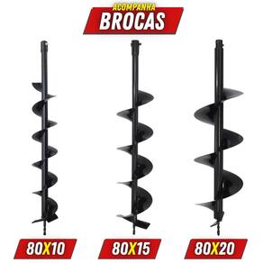 - Broca 80x10cm Com Pino Trava e Grampo - Tipo: Broca para perfurador de solo - Diâmetro da Broca: 10cm - Comprimento da Broca: 80cm - Acoplamento: o tamanho do furo pra encaixe do eixo da broca é de 2cm.