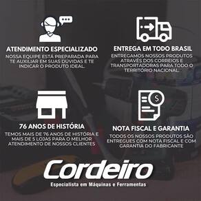 Com capacidade de perfuração de até 205 mm utilizando Brocas Diamantadas Merax.Refrigeração à água pelo interior das brocas.Montada em base suporte com fixação por chumbador e 04 parafusos de nivelamento.Posição do volante da cremalheira intercambiável.Possui botoeira de proteção, que evita o choque no operador em caso de fuga de corrente.Diâmetro máximo de perfuração: 205mmFrequência: 50/60HzPotência: 2400WVelocidade sem carga: 600rpmVoltagem: 220VMarca: MeraxModelo: Z1Z-CF02-205SKU: 22662** Não acompanha broca. ** Itens que Acompanham:01 Base suporte sistema cremalheira com fixação por parafuso e chumbador, com 4 parafusos de nivelamento.01 Jogo de Escova de carvão01 Chave Fixa 24/27mm01 Chave Fixa 32/36mm01 Chave Sextavada de 4mm01 Chave Sextavada de 5mm01 Chave Sextavada de 6mm *Imagens meramente ilustrativas.Loja Oficial Cordeiro Máquinas, a mais de 78 anos de tradição e confiança de nossos clientes!