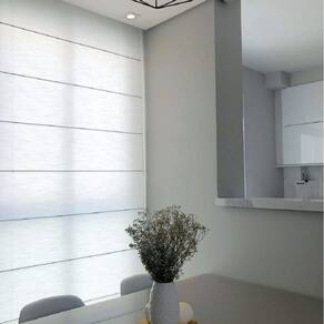 A persiana romana é formada por gomos largos e horizontais que dobram a medida que a persiana abre e fecha. O seu tecido translucido é uma solução para quem busca privacidade e ambiente claro, pois seu tecido permite a entrada de luz difusa, ainda assim bloqueando a visão exterior.