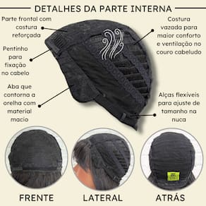 - Fibra orgânica premium; - 55cm de comprimento; - Aceita chapinha até 180ºC; - Peso 130g em média; - Possui três pentes internos para maior fixação; - Tamanho da peruca M (padrão) com alças internas ajustáveis; - Touca interna vazada (maior conforto, ventilação e flexibilidade). Marca: Não Informado