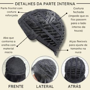 - Fibra orgânica premium; - 30cm de comprimento; - Aceita chapinha até 180ºC; - Peso 140g em média; - Possui três pentes internos para maior fixação; - Tamanho da peruca M (padrão) com alças internas ajustáveis;- Touca interna vazada (maior conforto, ventilação e flexibilidade). Marca: Não Informado
