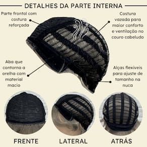 - Tamanho da peruca M (padrão) com alças internas ajustáveis.